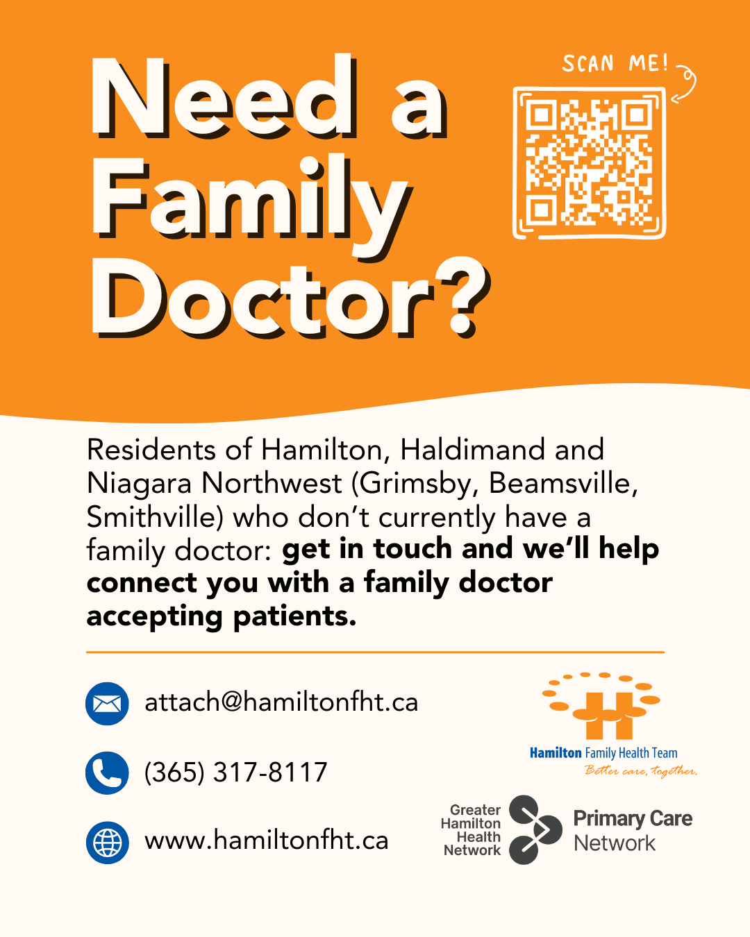 - Add our webpage link to your website: https://hamiltonfht.ca/team/find-a-family-doctor/